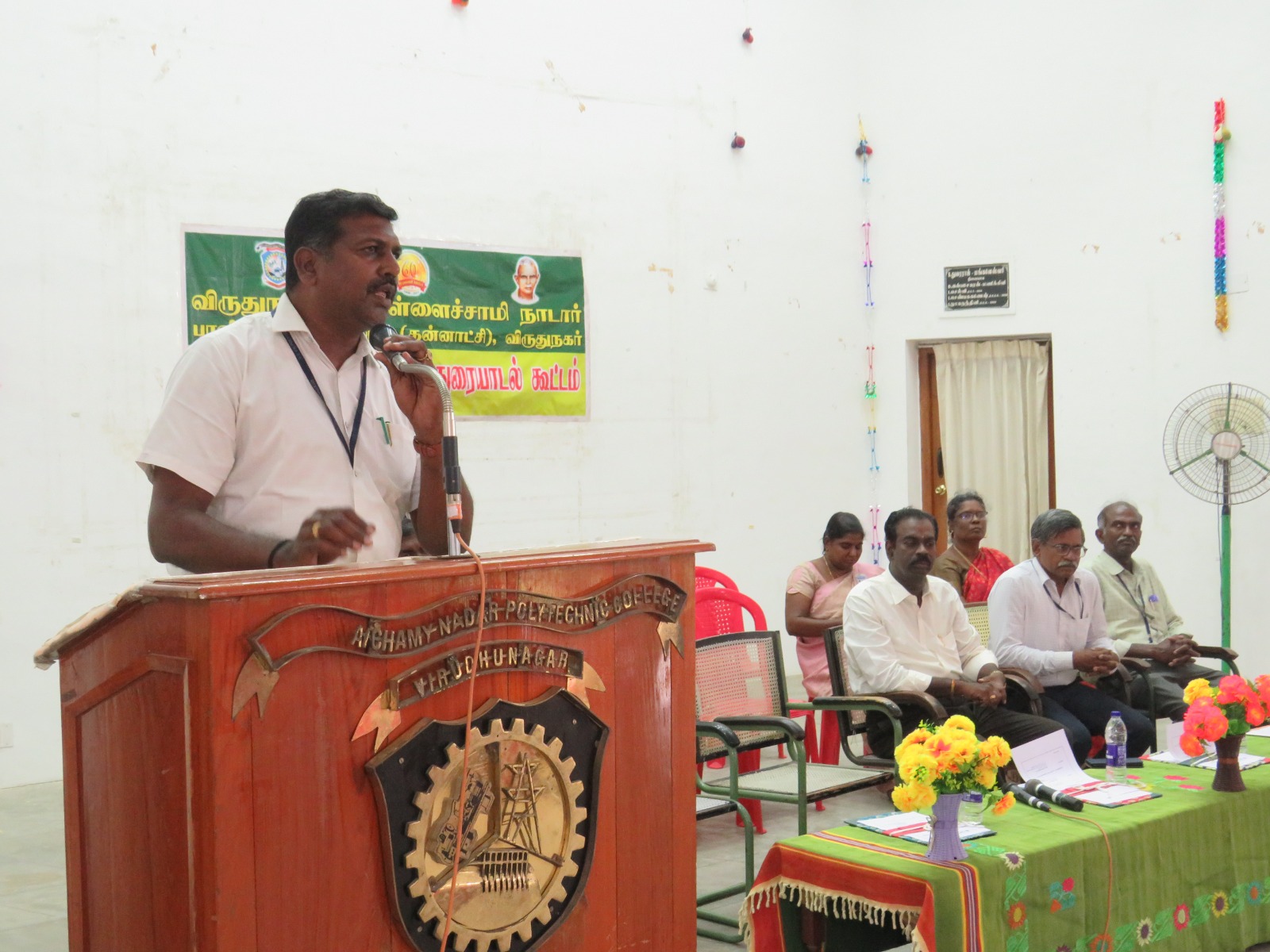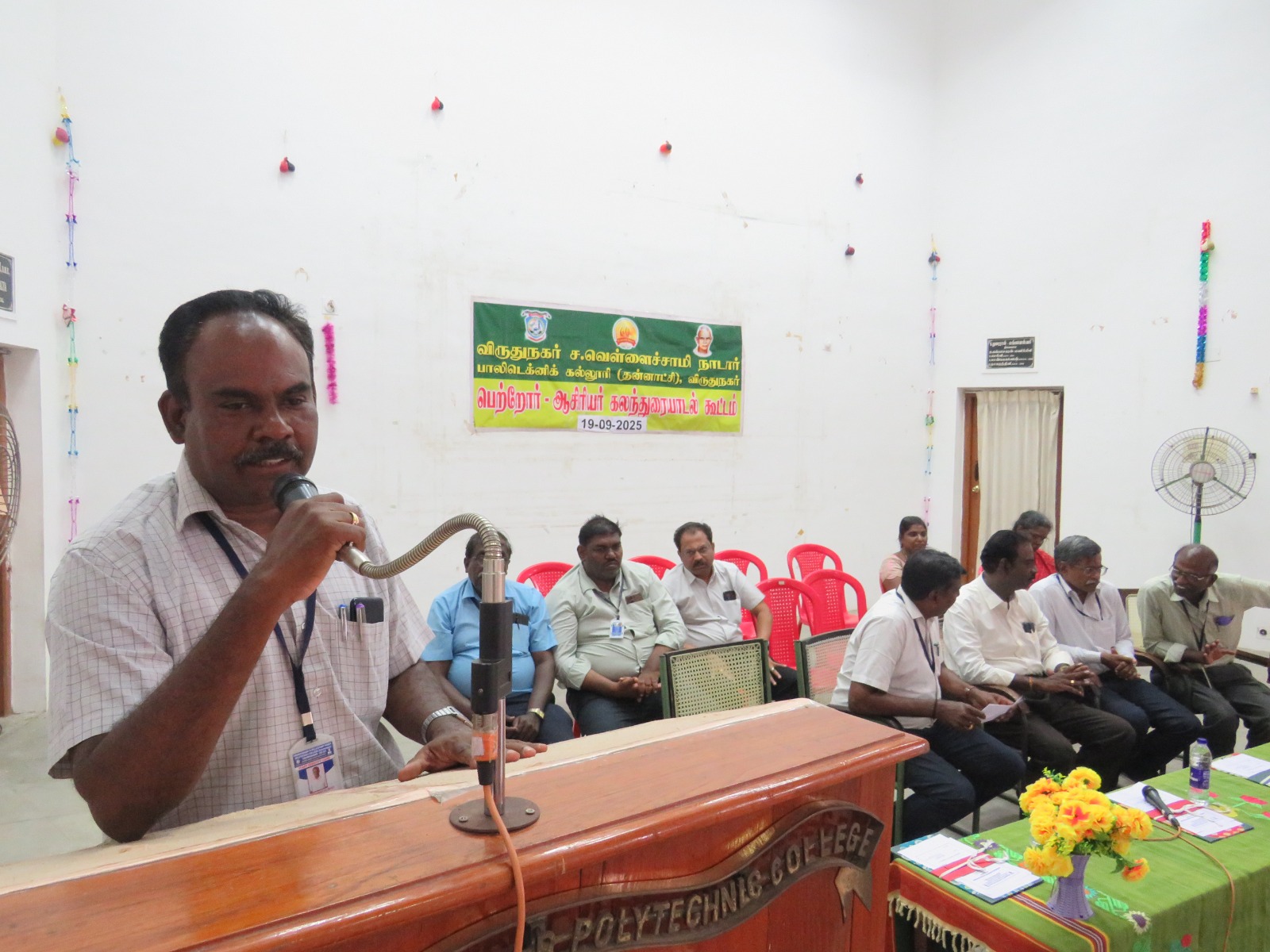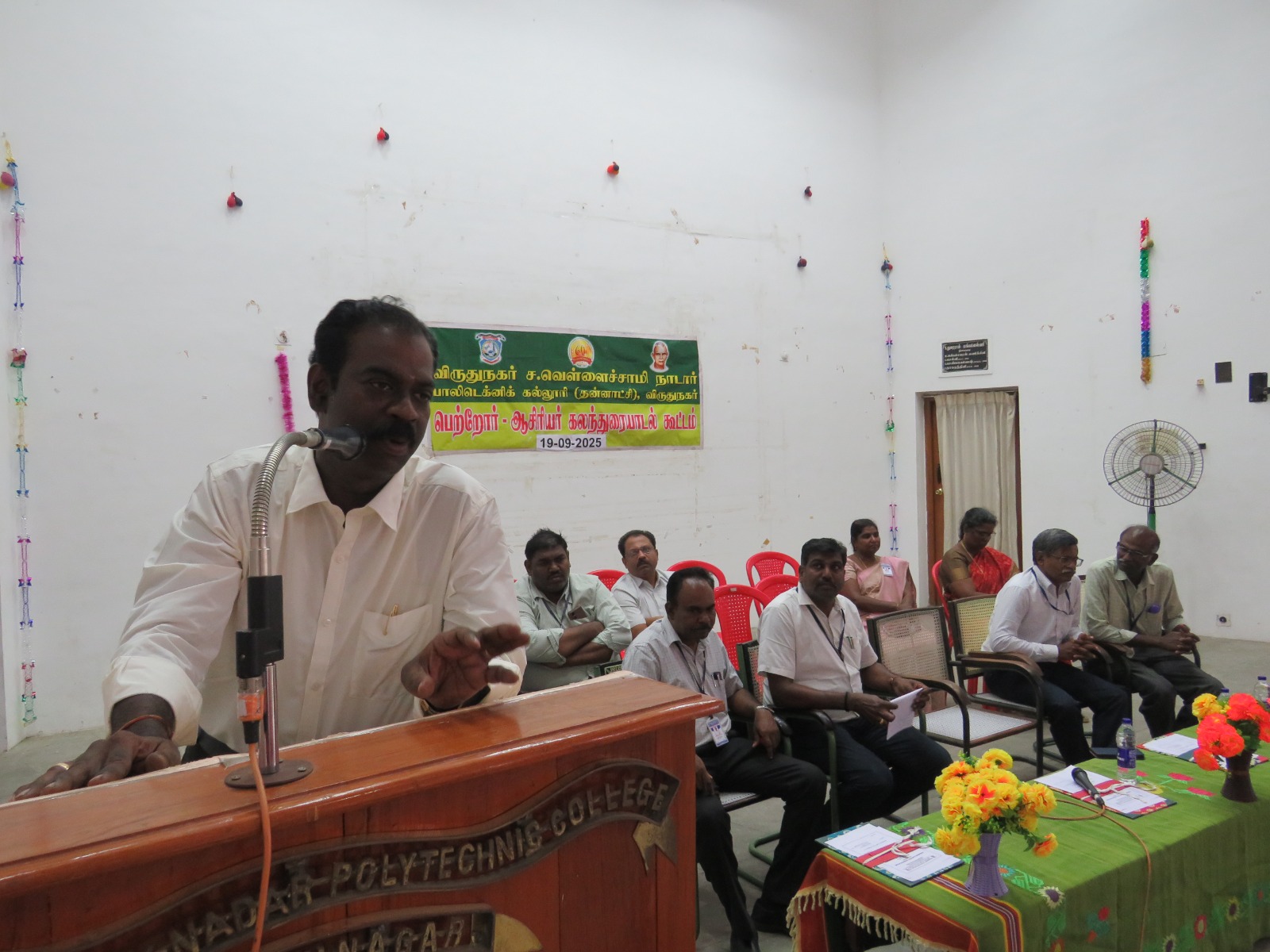 விருதுநகர் வெள்ளைச்சாமி நாடார் பாலிடெக்னிக் கல்லூரியில் பயிலும் தங்கள் மகன் / மகளின் கல்வி முன்னேற்றம், கற்றல் திறமை மற்றும் பிற துறைகளில் உள்ள திறமைகள் குறித்து கலந்துரையாடவும், கல்லூரி வளர்ச்சிக்கான தங்களின் கருத்துக்களை கூறவும். பெற்றோர் - ஆசிரியர் கலந்துரையாடல் கூட்டம் கல்லூரி வளாகத்தில் உள்ள பழைய மாணாக்கர் சங்க ஆடிட்டோரியம், விருதுநகர் இந்து நாடார்கள் அபிவிருத்தி பலசரக்குக்கடை மகமை அரங்கில் நடைபெற்றது.